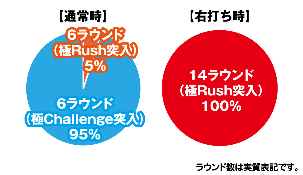 初回大当り後は95%で「極Challenge」、5%で「極Rush」に突入する。