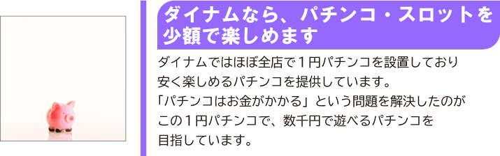 ダイナムは全国に400超の店舗を持つ日本最大級のパチンコホールです。分煙であること以外にも、気軽に楽しめるポイントが盛り沢山です。少額から楽しめる1円パチンコ・5円スロットなら「どのくらいお金が掛かるか不安」という方にも安心です。また、ダイナムがプロデュースするプライベートブランド「ごらくシリーズ」は、すべての機種が「遊べるタイプ」のパチンコ台。初めての方にもやさしく分かりやすいお店づくりを目指しています。