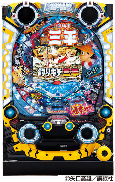 スペックは大当り確率1/99.9、新内規対応ヘソ1個賞球の遊パチタイプ。電サポが25回~次回大当りまで継続する確変「Sanpei Time」は約70.6%の継続率となっており、ウキウキ10による先読み演出で「爆」が5つ並べば「爆釣RUSH」が発動してSanpei Timeを上乗せする。また「ムツカケ」成功や「超三平ボーナス」、「無限ボーナス」からは次回大当りまで継続する「無限Sanpei Time」突入濃厚。演出ではウキギミックの動きに注目、三平が飛び出るイナズマキャストや閃光スライダーで期待度がアップし、魚大ギミックが出現する魚大インパクト予告で大チャンスとなる。