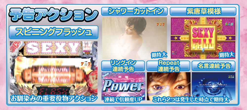 演出では、スピニングフラッシュ、紫唐草模様、SPorSPSPナレーション、群予告に注目しよう。