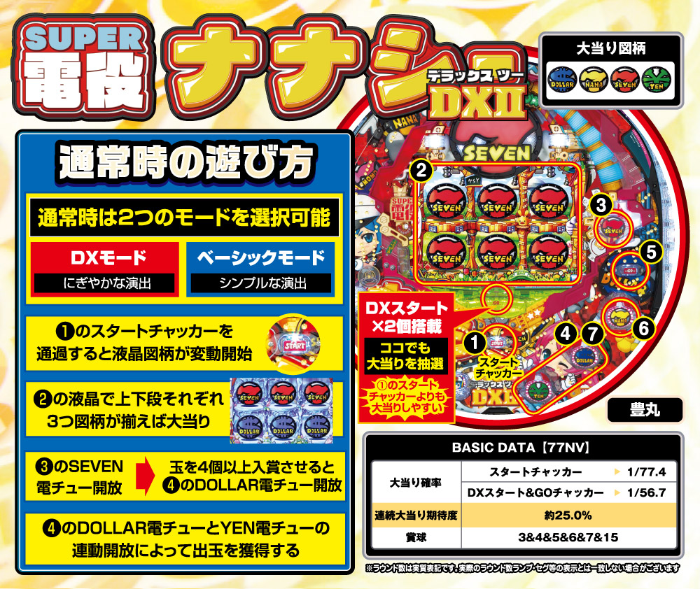 スペックは、大当り確率 スタートチャッカー:1/77.4、DXスタート&GOチャッカー:1/56.7、連続大当り期待値 約25.0%となっている。