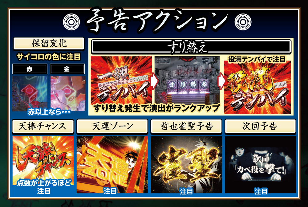 演出面では、4大チャンスとなる「ドサ健リーチ」、「哲也雀聖予告」、「天運ゾーン」、「役満テンパイ」に注目しよう。