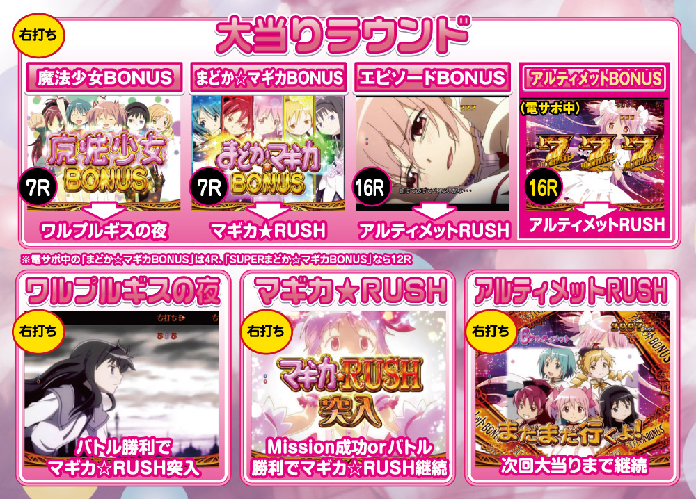 「CRぱちんこ魔法少女まどか☆マギカ」に、大当り確率1/228.3、RUSH突入率 約52%(大当り後の「ワルプルギスの夜」経由を含む)のライトミドルタイプが追加となった。