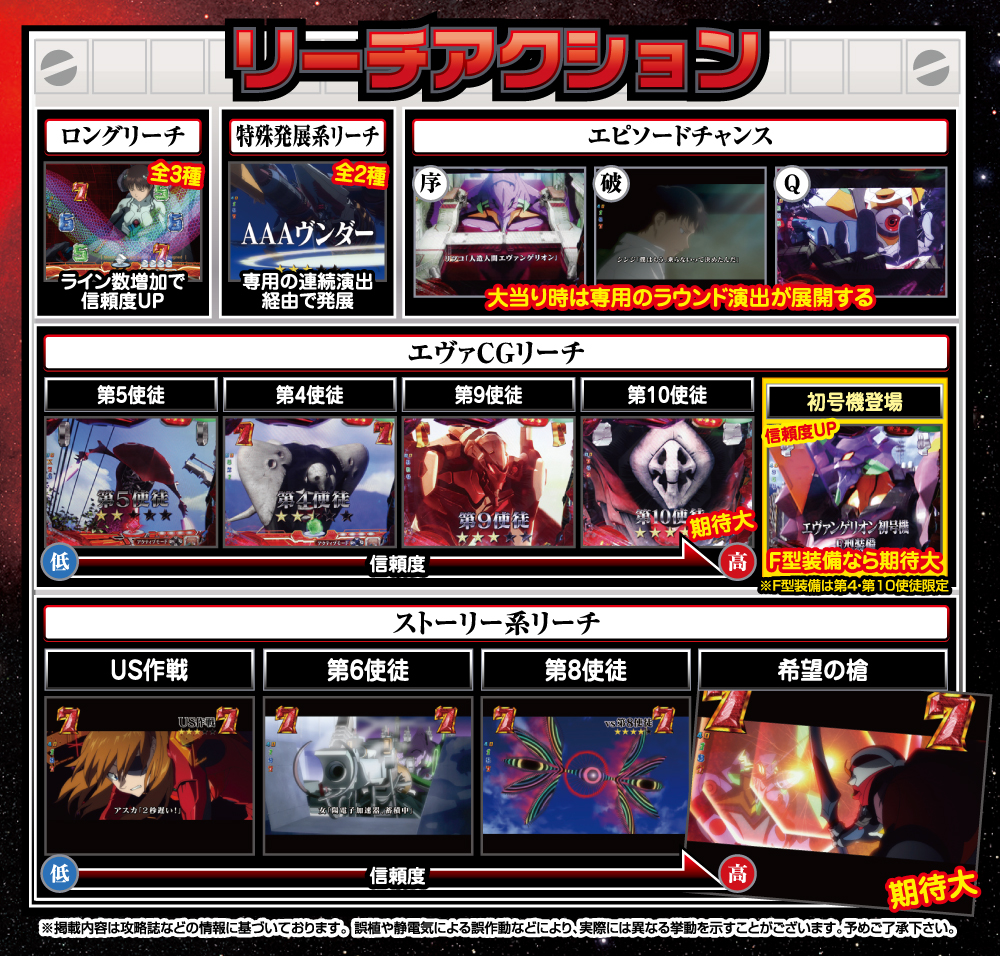 図柄揃い大当りから突入する「バトルモード」はエヴァ勝利でモード継続濃厚、警報図柄停止の「起動チャレンジボーナス」は起動成功でバトルモードへ突入、「警戒態勢モード」は潜伏の可能性があるので、移行時はしばらく様子を見よう。