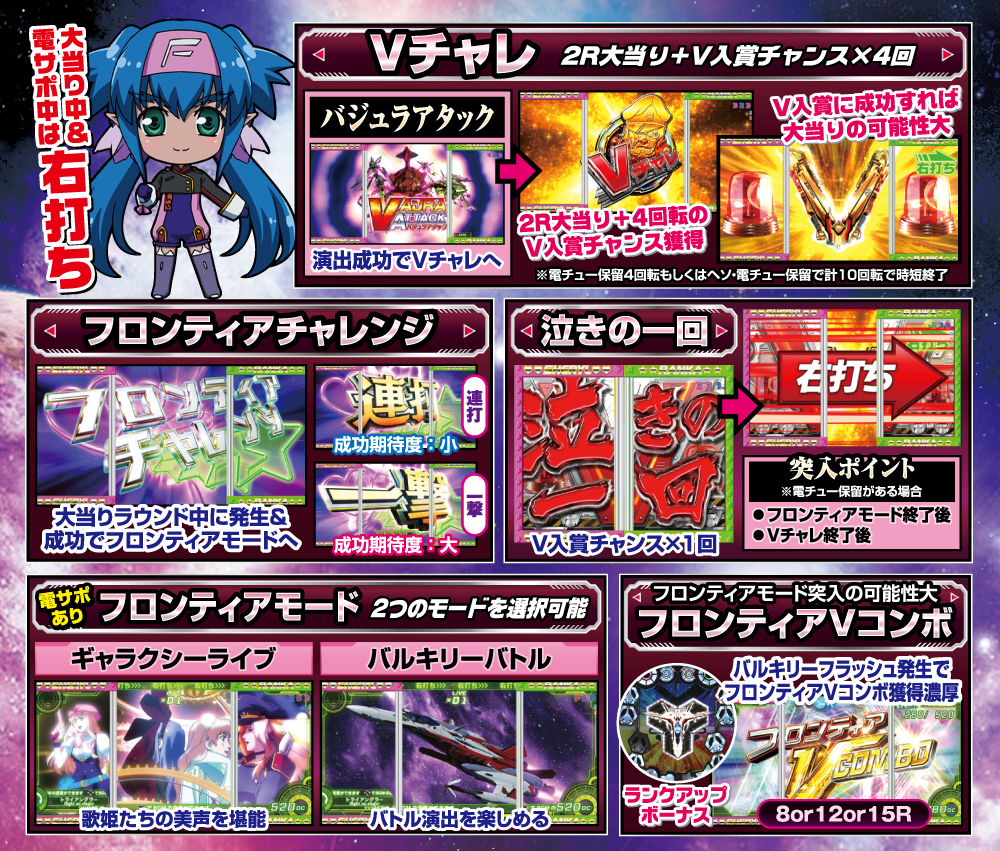 右打ち時のフロンティアモード継続濃厚となるランクアップボーナス「フロンティアVコンボ」はキャラクターによって3種類のパターンがある。