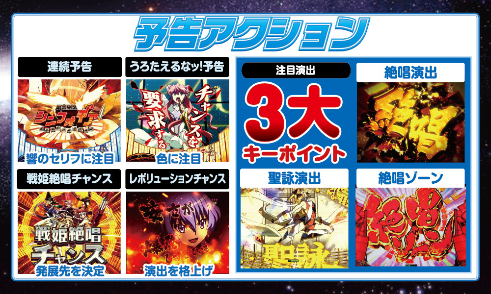 演出面では3大キーポイントとなる「絶唱」、「絶唱ゾーン」、「聖詠」に注目しよう。
