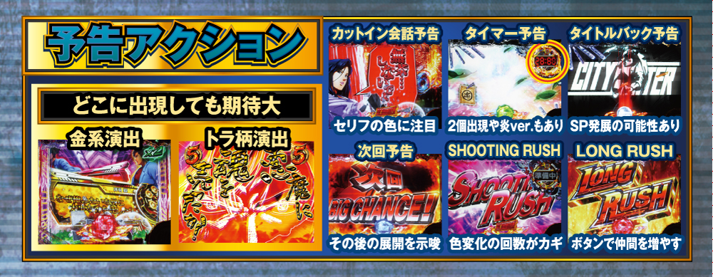 演出面では液晶ビジュアルのほか、「XYZギミック」、「レティクルギミック」、点灯し続ける限りチャンスを示唆する「CITY HUNTER RUSHランプ」など多彩なギミックにも注目しよう。