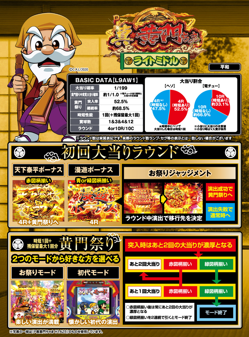 黄門祭り消化中の大当りは図柄が重要で、赤図柄揃いなら+2回の大当りを獲得できる2回ループタイプとなっている。緑図柄を2連続で引くとモード終了なので、どの図柄でリーチに発展するかに注目しよう。