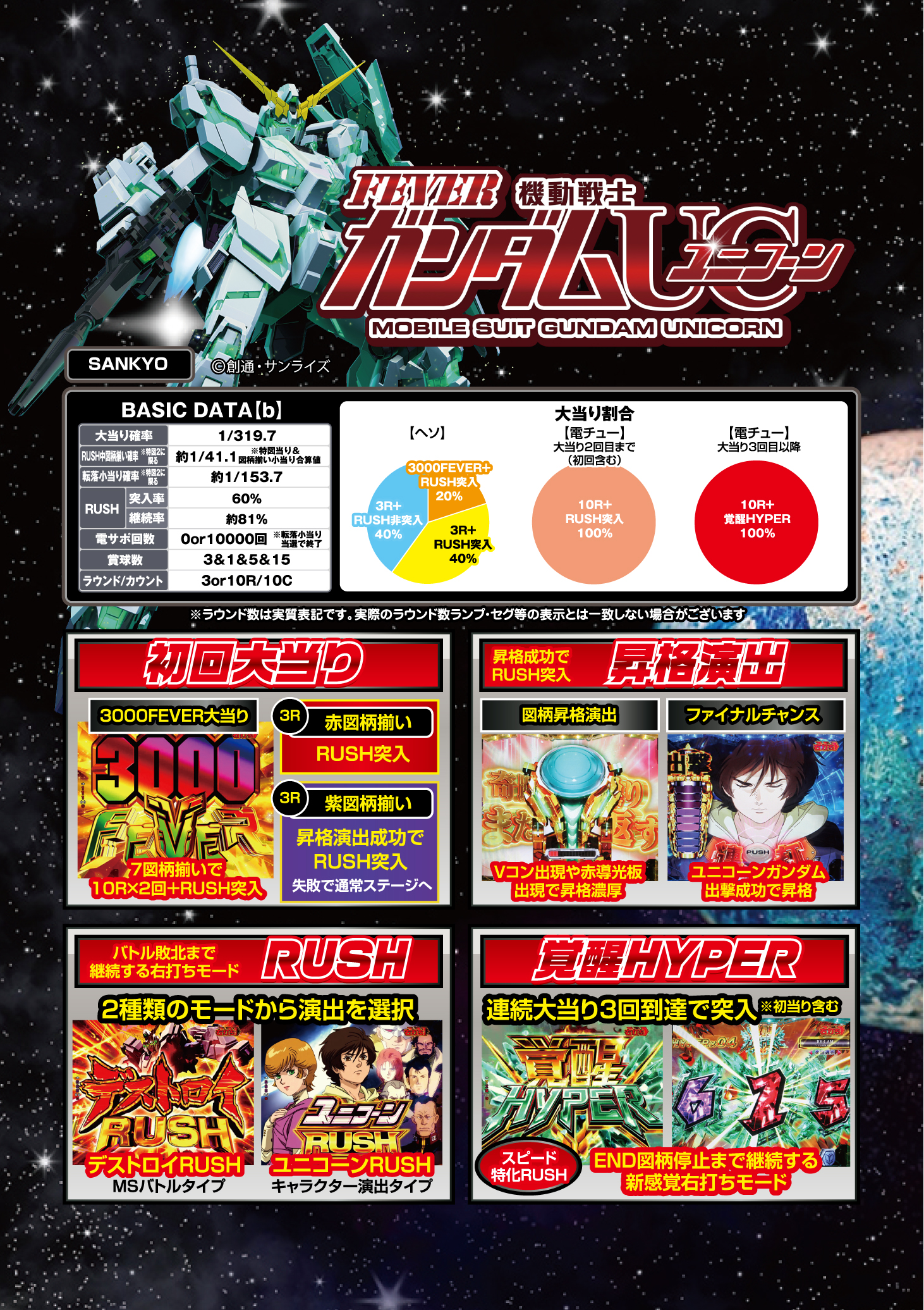 通常時の演出は「強背景予告」「赤い彗星の再来ゾーン」「ガンダムユニコーン予告」「可能性の獣」や、最重要リーチの「頂上対決SPリーチ」に注目だ。
