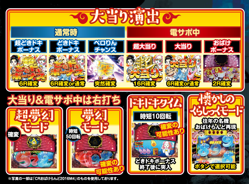 演出面では、「オカルト鍵穴演出」、「オカルトお祈り演出」、「ひっそりマイウィンドウ」など、様々なオカルト演出が搭載されている。