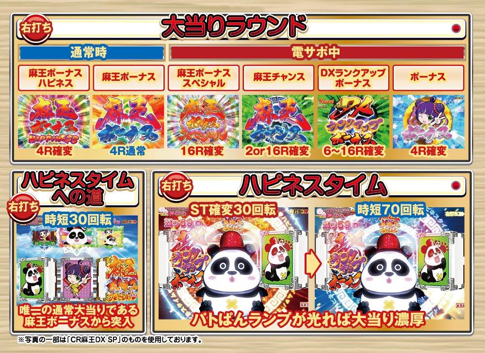 通常時大当りは、4R確変の「麻王ボーナスハピネス」と4R通常の「麻王ボーナス」の2種類。