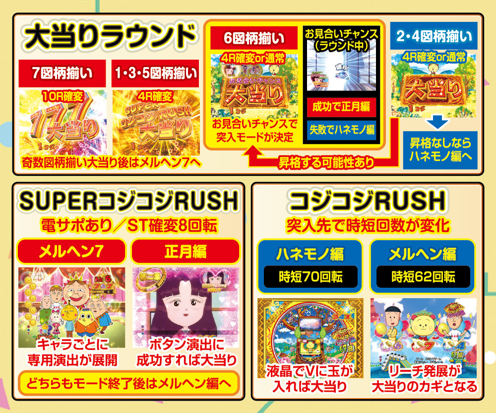 演出は「メルヘン7」と「正月編」の2種類で、終了後は62回転の時短「コジコジRUSH(メルヘン編)」に突入。