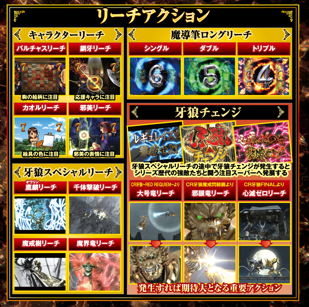 演出面では、牙狼SPリーチ中に新演出「牙狼チェンジ」が追加され、発生すれば歴代牙狼シリーズで搭載されていた「雨宮SPリーチ」にリーチが変化し、大当りの期待が高まる。