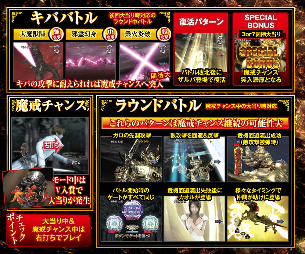 演出面では、牙狼SPリーチ中に新演出「牙狼チェンジ」が追加され、発生すれば歴代牙狼シリーズで搭載されていた「雨宮SPリーチ」にリーチが変化し、大当りの期待が高まる。