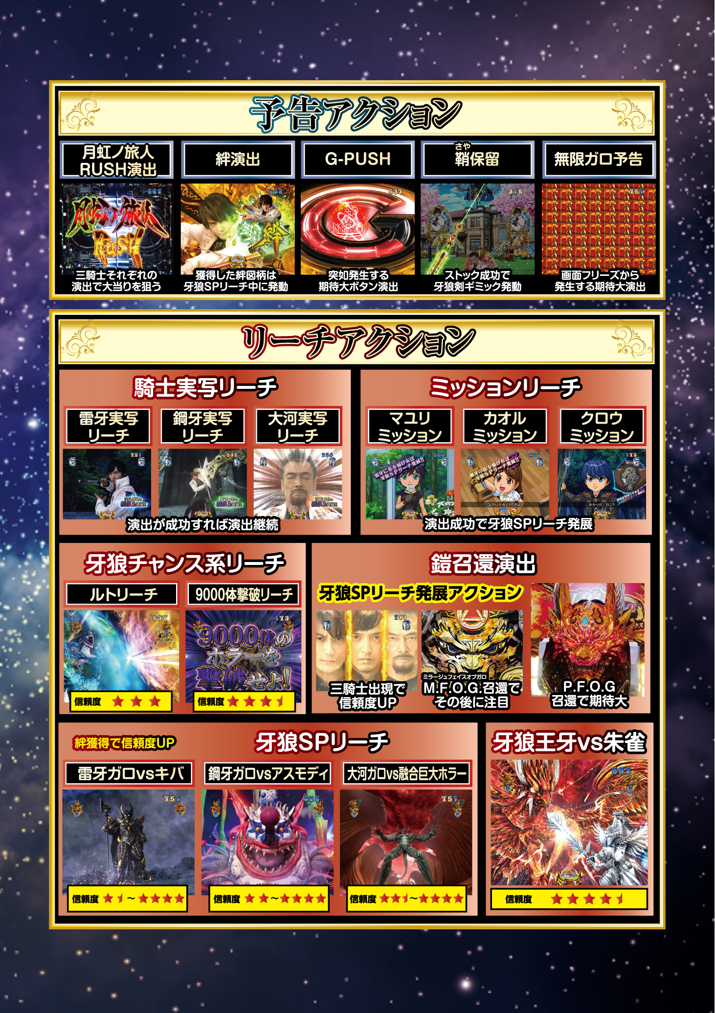 通常時の演出は「絆演出」「G-PUSH」「鞘保留完成」「無限ガロ予告」、そして「牙狼王牙vs朱雀」などに注目しよう。