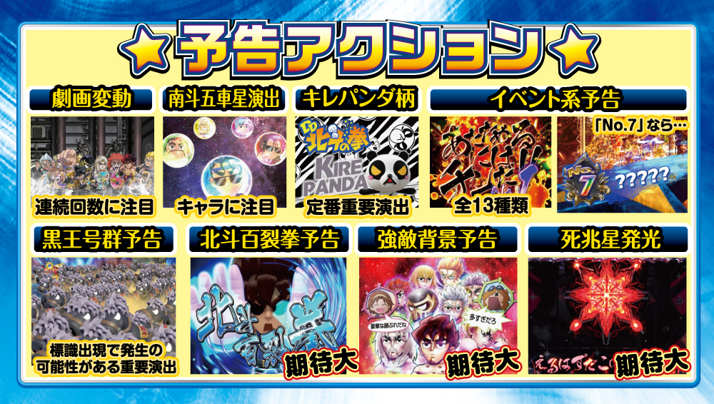演出では「強敵背景予告」、「死兆星ランプ」、「百裂拳演出」がチャンス。