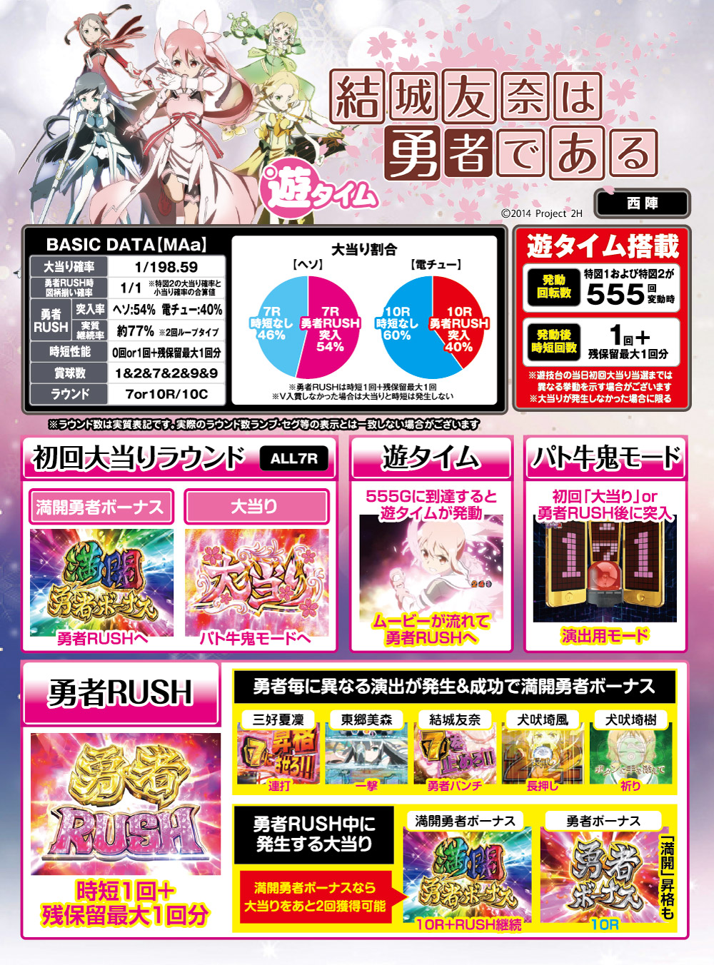 RUSHは時短1回(残保留最大1回)だが、消化中の図柄揃い確率は1/1(大当り+小当り合算)なので、突入すれば最低でも2回の大当りを獲得可能。さらにRUSH中も満開勇者ボーナスを引ければ、RUSH継続となる2回ループタイプ(実質継続率は約77%)となっているぞ。