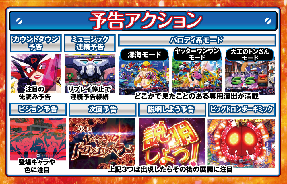 また、「ビッグドロンボーギミック」「次回予告」「説明しよう予告」「タイムボカンオールスターズ集結リーチ」の4大ハイライト演出に注目しよう。