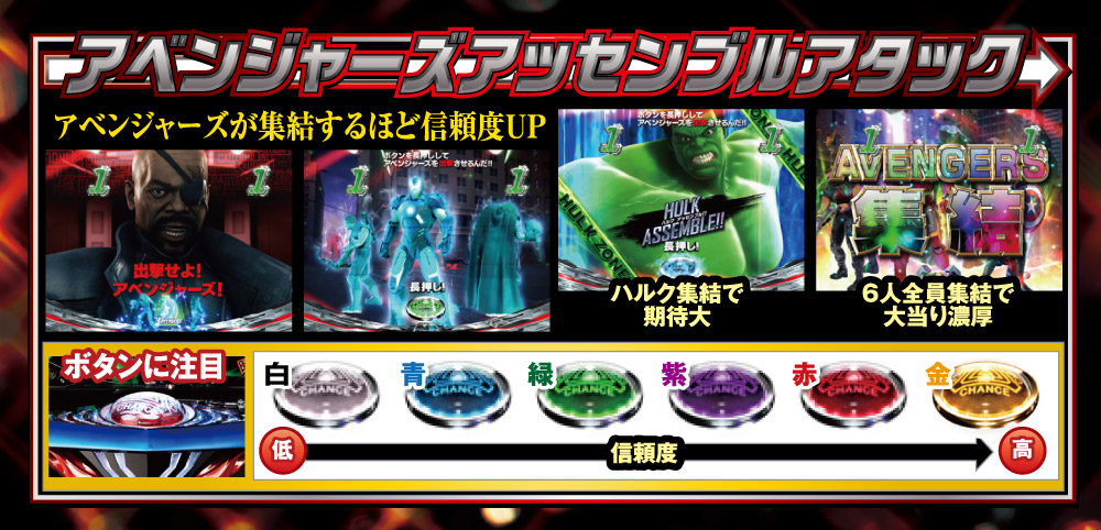 通常時からの大当りのほとんどが「AVENGERS BONUS(6R)」となり、ラウンド終了後はST50回の「AVENGERS RUSH in JAPAN」に突入する。