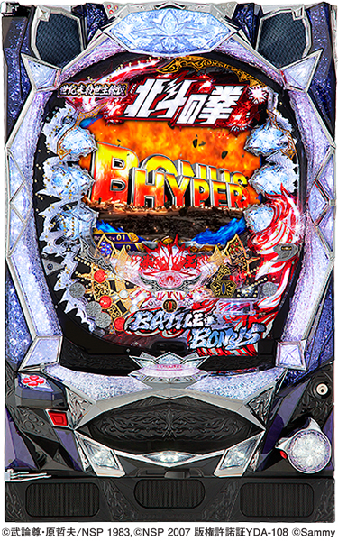 シリーズ第6弾となる本機は、大当り確率約1/394.8、確変突入率80%で、もちろんゼロアタッカーも搭載。新演出「世紀末チャレンジ」失敗から突入する「断末魔モード」や、4R大当りの「拳王BONUS」後に突入する「拳王ステージ」では高確率のチャンスあり。また、確変「バトルモード」終了後には「無想・転生モード」へ移行し、確変復帰の可能性あり。前作「覇者」よりも演出量が約2倍に増え、シリーズ最多のキャラクターが登場。確変「バトルモード」中には、これまでのキャラに加えて特定条件を満たすことでジャギやアミバが選択できるようになっている。