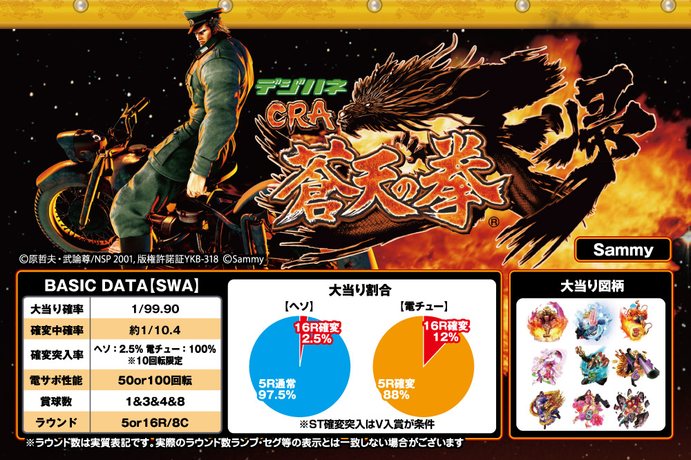 「ぱちんこCR蒼天の拳天帰」に、大当り確率1/99.90、確変突入率はヘソからが2.5%、電チューからは100%の遊びやすいスペックが追加となった。