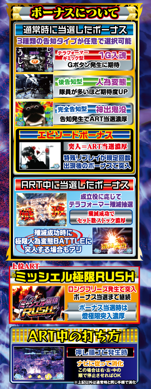 スペックは純増約1.9枚のA+ARTで、通常時のボーナス「テラフォーマーチャンス」はART突入チャンス、ART中のボーナス「テラフォーマーチャンス殲滅」はARTストックとバトル突入のチャンスになる。