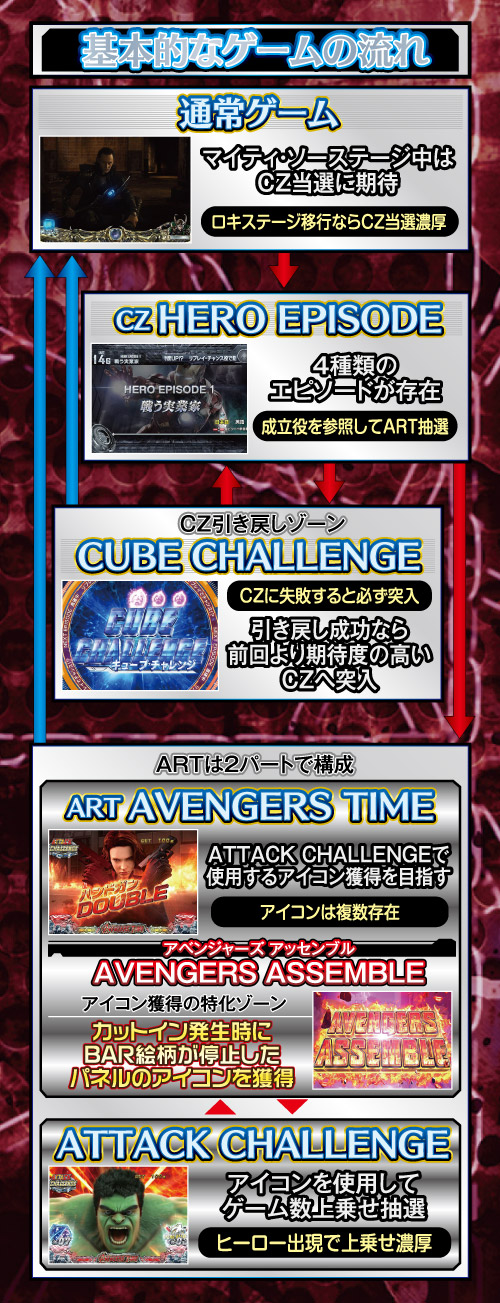 スペックは純増約2.0枚のART特化タイプで、ART「AVENGERS TIME」は初期ゲーム数50G+αのゲーム数上乗せ型となっている。