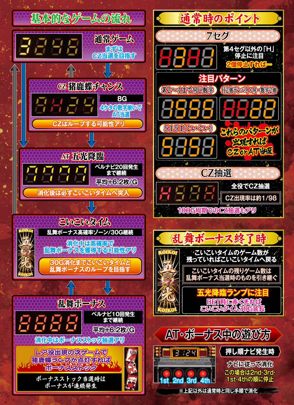 基本的に、まずはCZ「猪鹿蝶チャンス」からAT「五光降臨」(平均220枚獲得)突入を目指す。