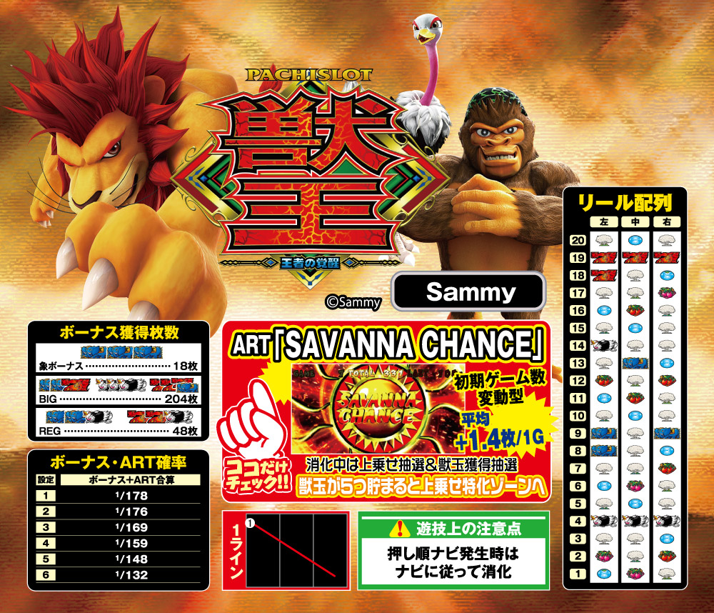 「サバンナチャンス」中は、“獣玉”を集めるほどチャンスとなり、獣玉5個獲得でゲーム数上乗せ特化ゾーン「ビーストアタック」に突入。
