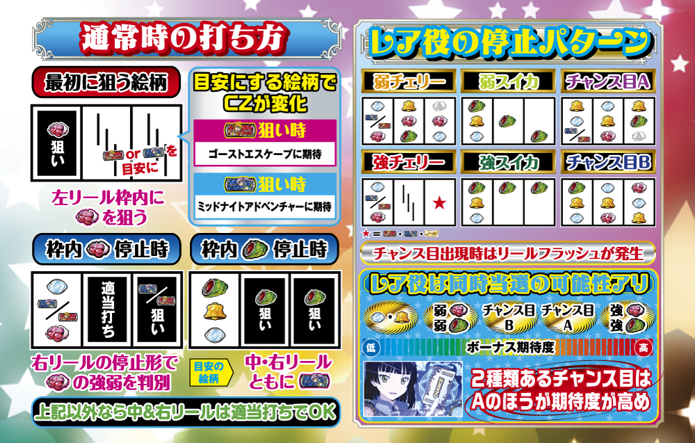 また、狙う図柄(赤BARor青BAR)によって突入するチャンスゾーン・上乗せ特化ゾーンが変化するのも特徴となっている。