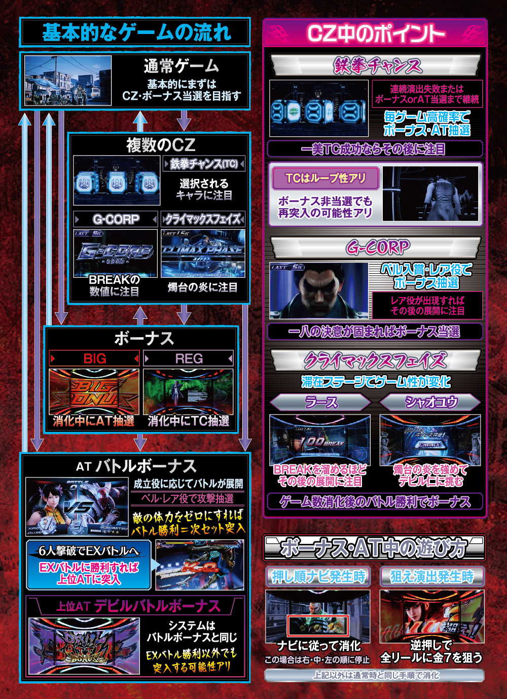 通常時はCZ「クライマックスフェイズ」、CZ「G-CORP」、シリーズお馴染みの「鉄拳チャンス(TC)」を目指す。