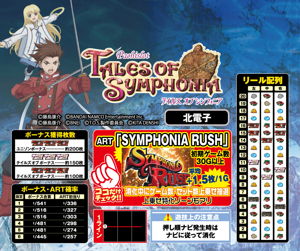 ボーナスは、「TALES OF BONUS(約100枚or約150枚)」、赤7揃い「UNISON BONUS(約200枚)」があり、UNISON BONUSは当選時点でART濃厚となる。
