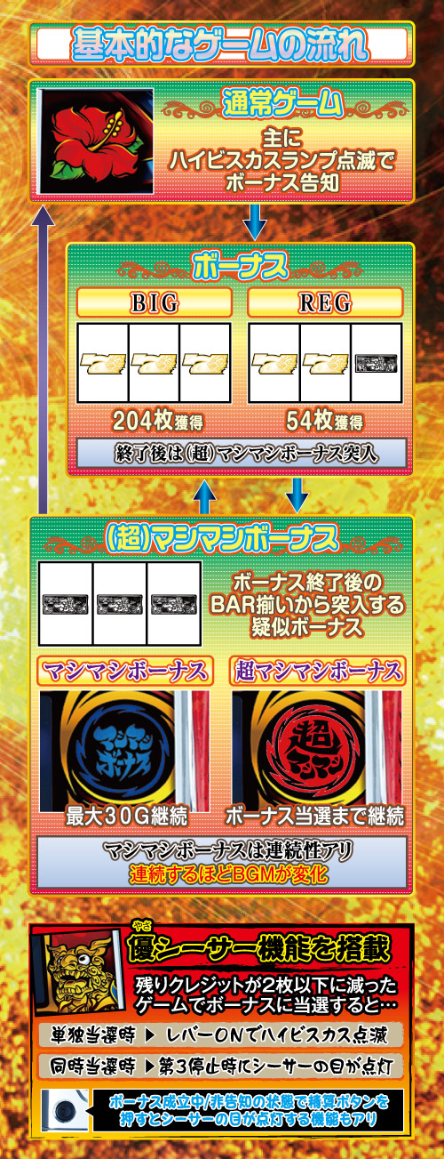 基本的なゲーム性はリール上部のハイビスカスが点滅すればボーナス当選。