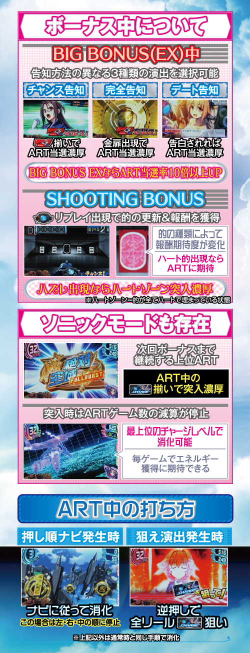 ボーナスは、赤7揃いの「BIG BONUS EX(200枚)」と異色7揃いの「BIG BONUS(200枚)」と赤7・赤7・BAR揃いの「SHOOTING BONUS/殲滅ボーナス(約50枚)」の3種類。