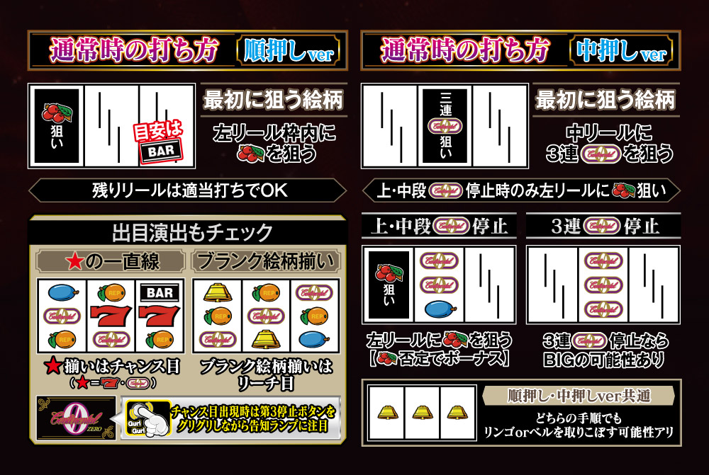 チャンス目出現時やチェリー成立時は、告知ランプに注目しよう。また、プラム入賞時の払い出し音が遅れればボーナス当選の可能性あり。