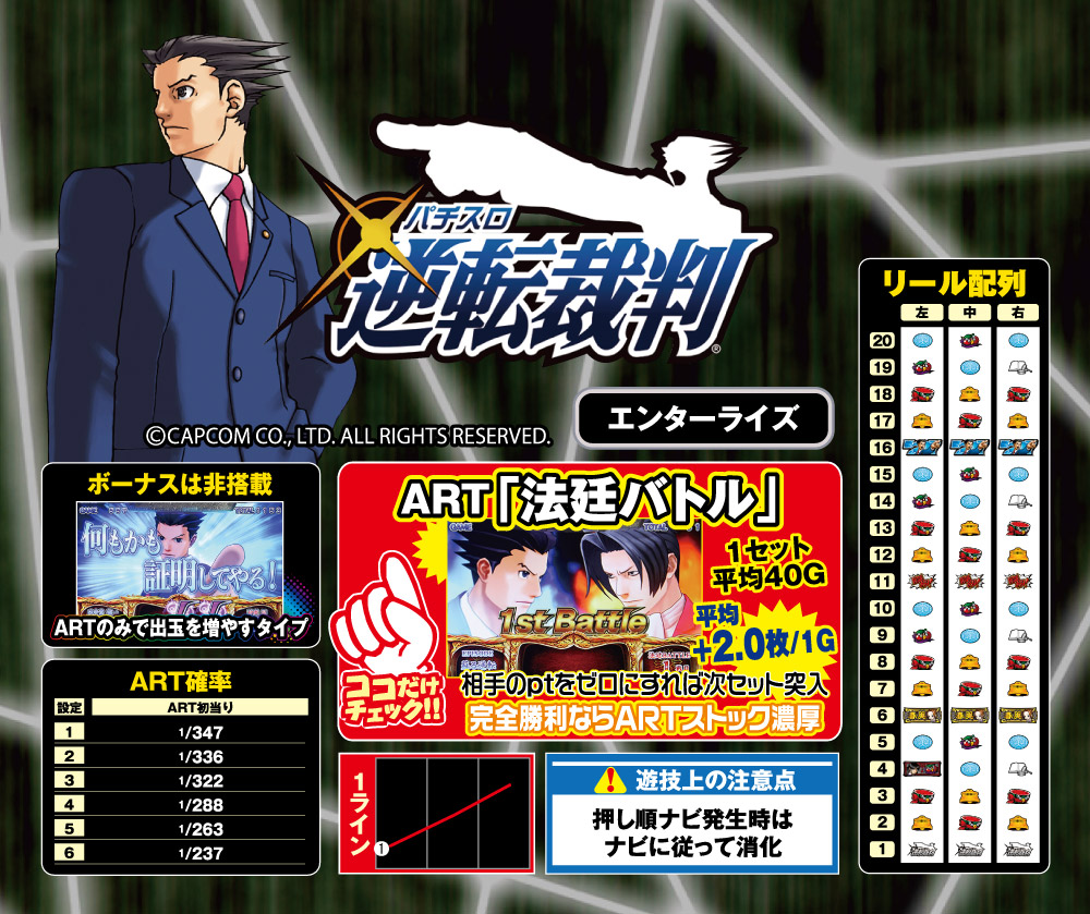 ART「法廷バトル」は1セット平均40G継続で、基本的には「説明・証言パート」→「尋問パート」→「つきつけパート」の3つのパートでストーリーが展開。