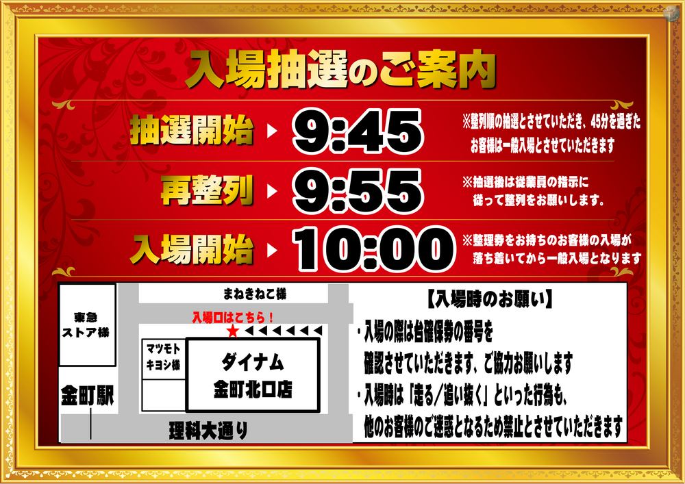45分までにお集まりのお客様を対象に、【整列順】で抽選を開始します。