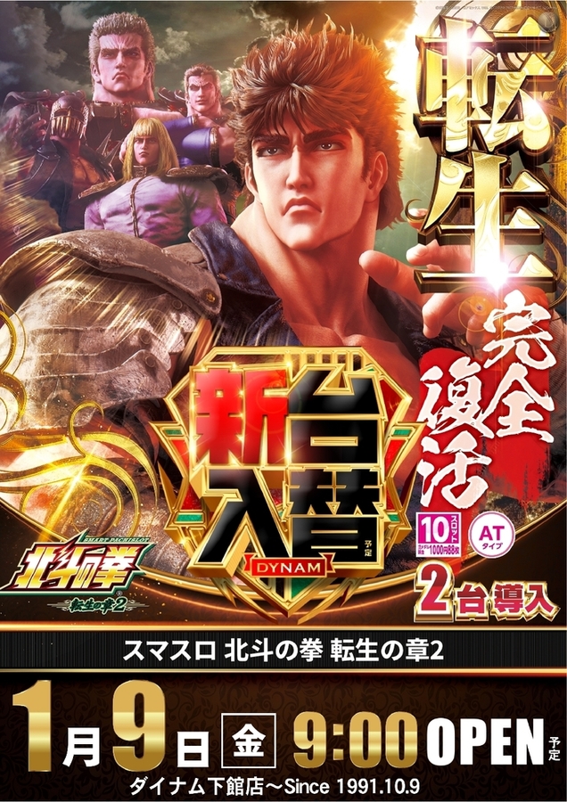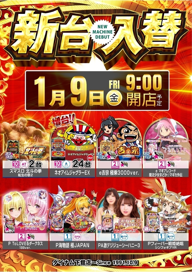 1月9日(金) ★NEW★☆★NEW★☆★NEW★☆★NEW★☆★NEW★ 新台入替 9時オープン(予定) ★NEW★☆★NEW★☆★NEW★☆★NEW★☆★NEW★