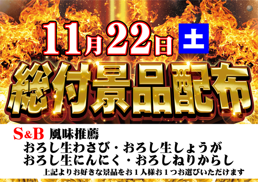 S&B 風味推薦 おろし生わさび おろし生しょうが おろし生にんにく おろしねりからし を配布致します 上記より、お好きな景品をお選びいたいただけます。 ※お1人様おひとつまでとなります。 皆様のご来店を お待ち致しております