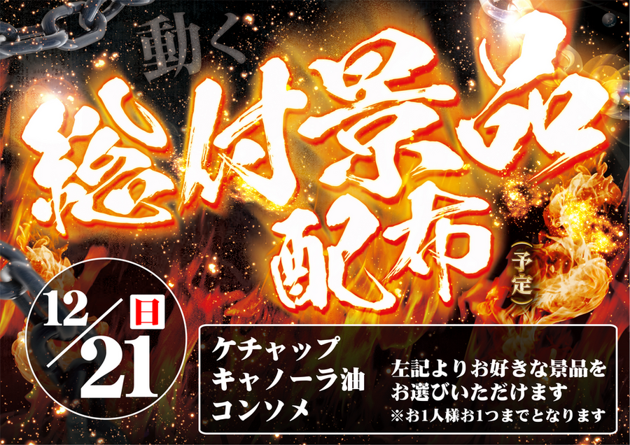 ケチャップ キャノーラ油 コンソメ を配布致します 上記より、お好きな景品をお選びいたいただけます。 ※お1人様おひとつまでとなります。 皆様のご来店を お待ち致しております