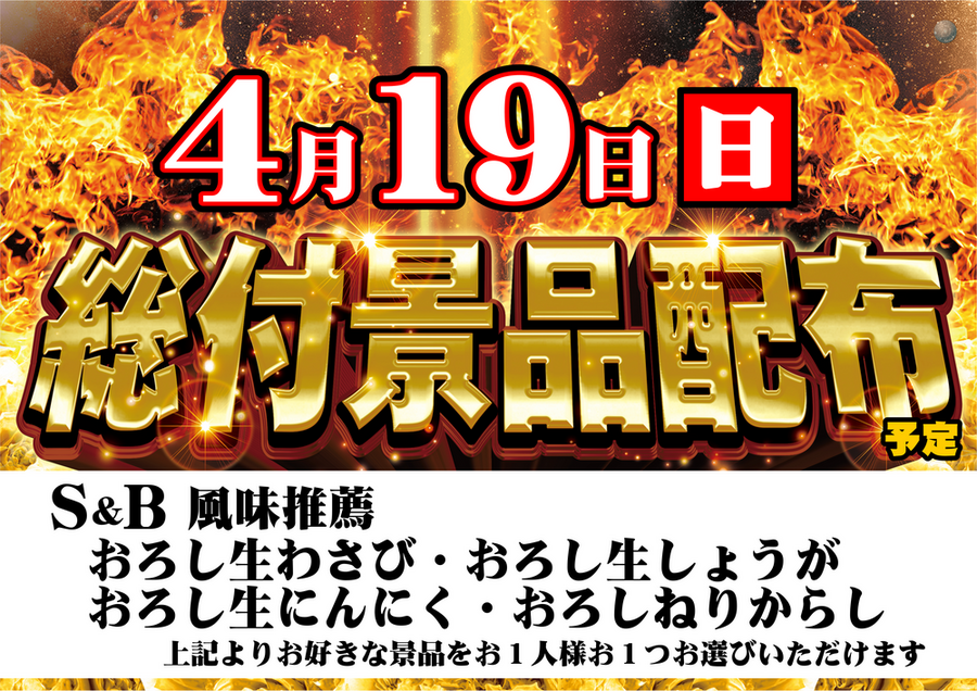 S&B 風味推薦 おろし生わさび おろし生しょうが おろし生にんにく おろしねりからし を配布致します 上記より、お好きな景品をお選びいたいただけます。 ※お1人様おひとつまでとなります。 皆様のご来店を お待ち致しております