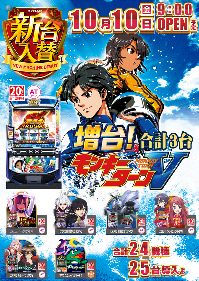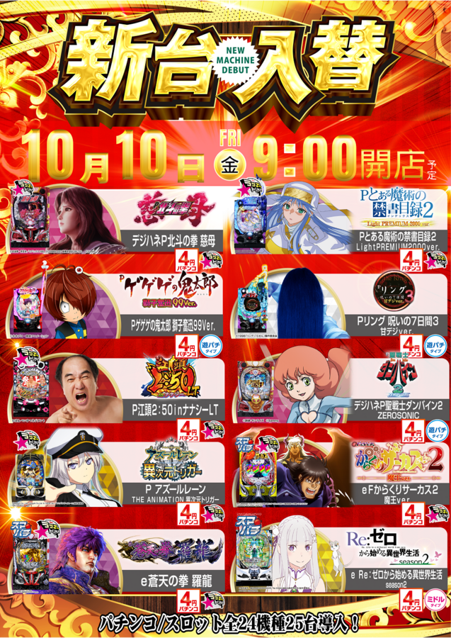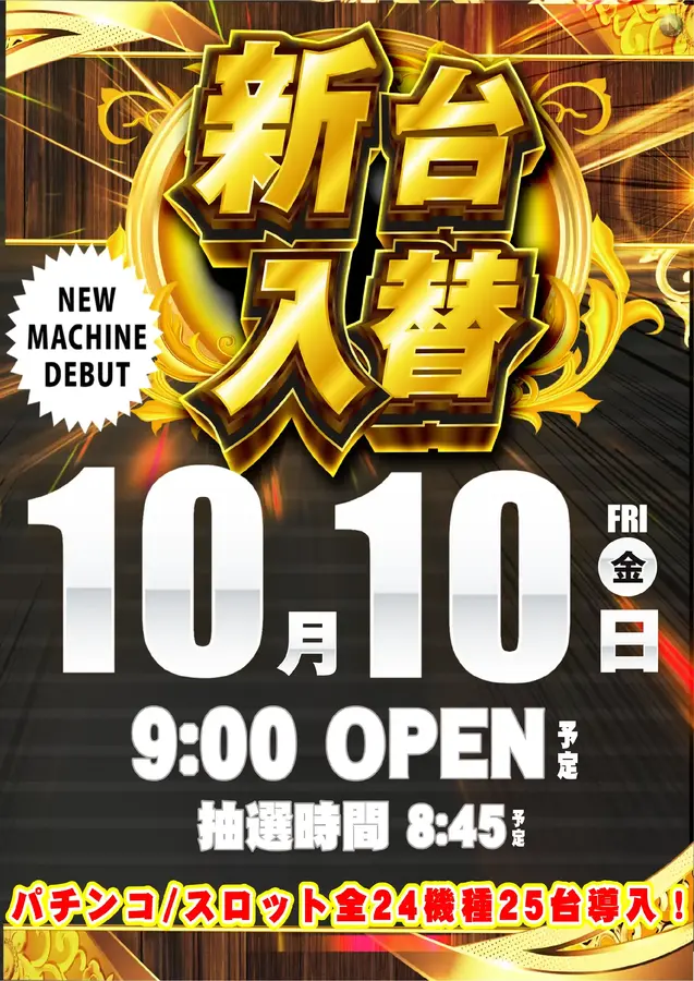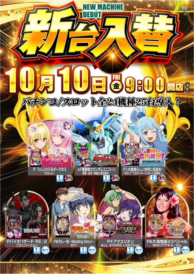 10月10日(金)新台入替開催! 前日の10月9日(木)は店休日とさせて頂きます。