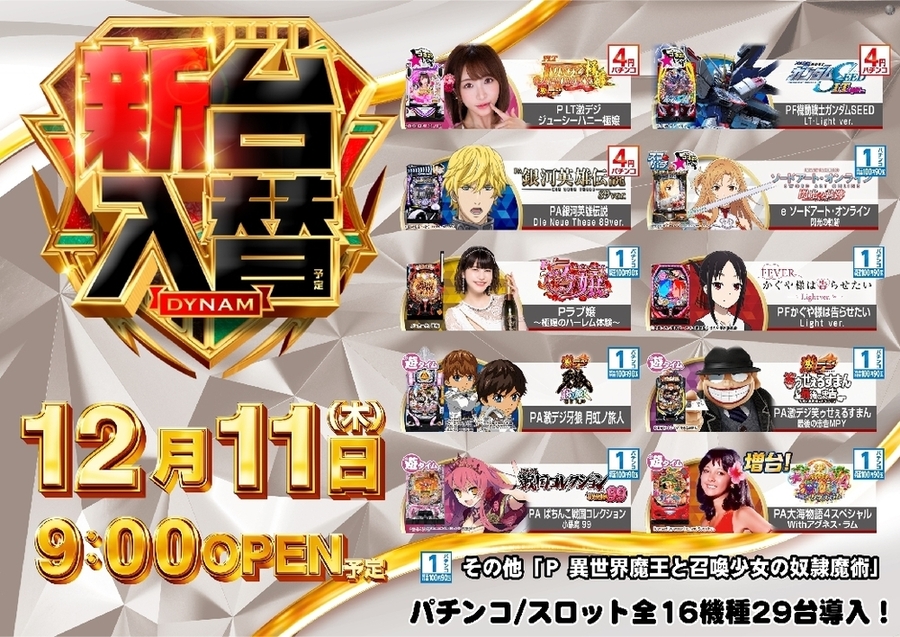 12月11日(木)新台入替開催! 前日の12月10日(水)は店休日とさせて頂きます。