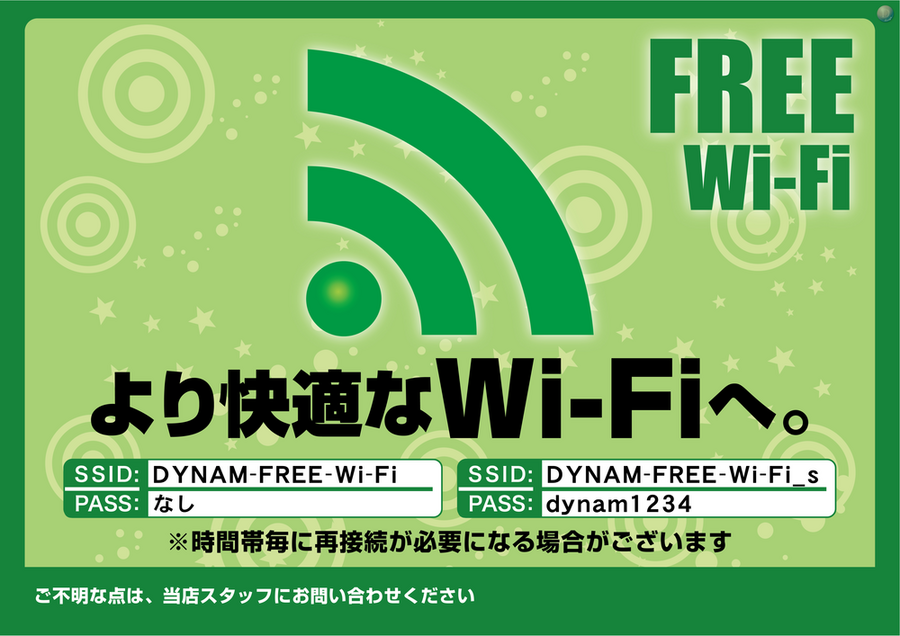 ②SSID:DYNAM-FREE-WiFi_s パスワード:dynam1234