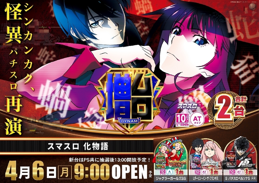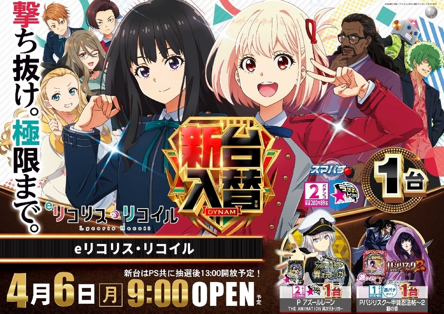 2パチンコ(200円89玉) eリコリス・リコイル 1台 P アズールレーン THE ANIMATION 異次元トリガー 1台 1パチンコ(100円89玉) Pバジリスク~甲賀忍法帖~2 朧の章 1台 10スロット(1000円89枚) スマスロ 化物語 1台増台 ジャグラーガールズSS 1台 Lダーリン・イン・ザ・フランキス 1台 S パチスロペルソナ5 FR 1台 |
