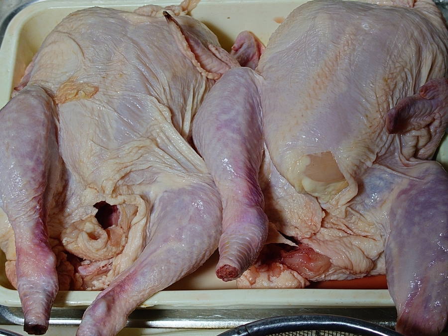 半面で鶏肉に熱量が遮られて、詰め物には火が通りにくい、ということも念頭に置いておきます。
