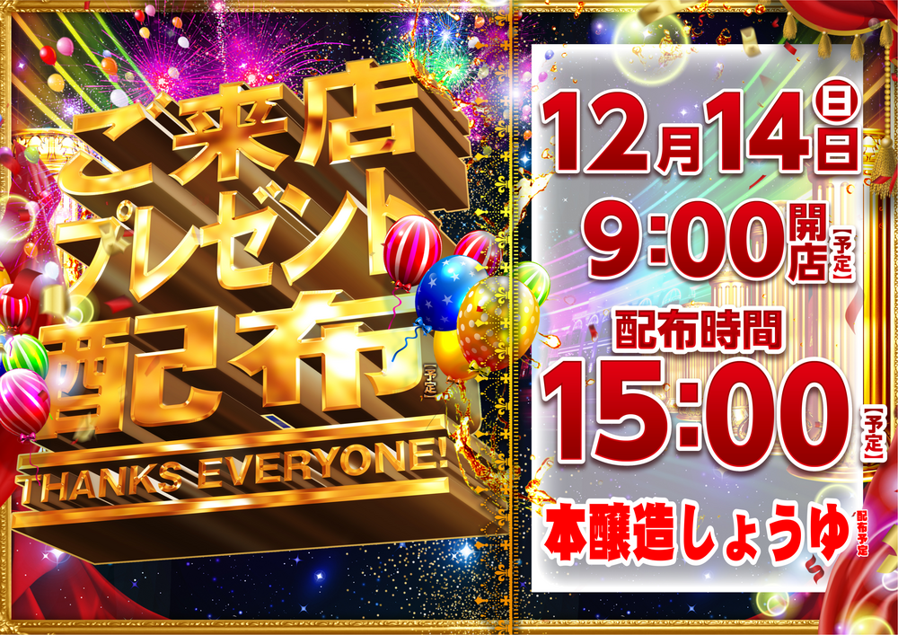12/14 曜 朝9時開店(予定)
