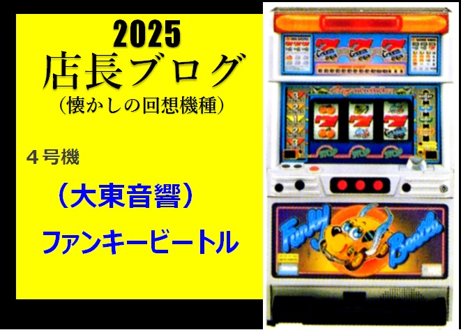 スタンダードなAタイプ機として、いまはナキ「大東音響」から「ファンキー」なビートル(甲虫)スロットが登場しました。同社初の4号機ザンガスⅠ同様、BRフラグ成立後、最終リール停止から揃えるまで、けたたましい告知音が鳴り続けます。迷惑告知とも。なお、ホールに登場したほとんどの台は、改造を施された違法機であったとのこと(真意は不明ですが)