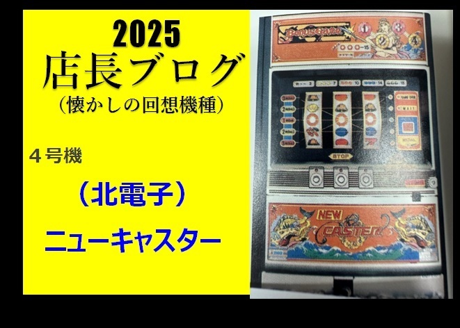 「北電子のオールド」を探すと1号機に「ニューキャスター」なるマシンが。ダイヤでBIG、777でREG一風変わった役構成。このマシンの初代「キャスター」には致命的ミスが発覚し、変則打ちの小役抜きが可能であった。そのため、対策を施し絵柄配列や小役の払出周期など調整したのがニューキャスター。しかし小役周期狙いのハイエナ、百枚程度コインを持って渡り歩く「ウロツキ」攻略が横行するのでした。(END