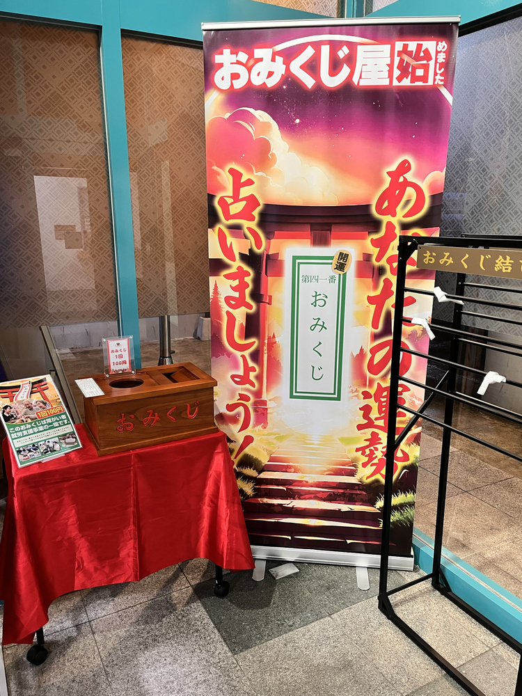 当店のカウンター側入口にて 【おみくじ屋コーナー】設置中! ⇒ おみくじ1回100円 です